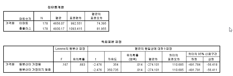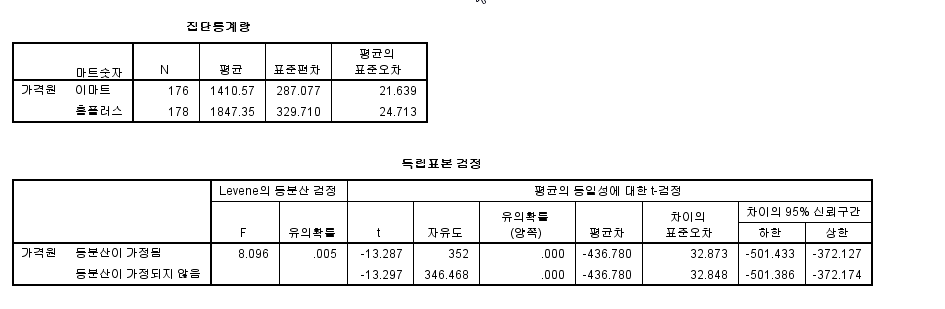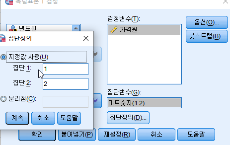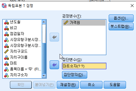 검정변수에 가격원을 집단변수에 마트숫자를 넣었습니다.