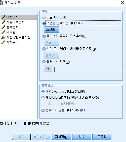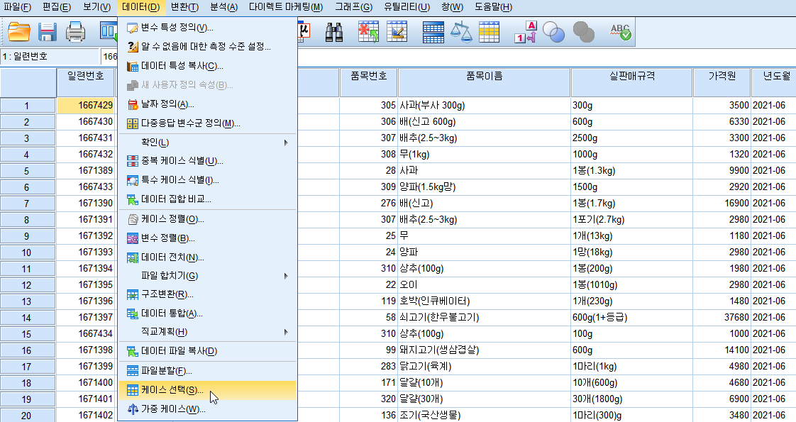 메뉴에서 데이터 > 케이스 선택을 클릭합니다.