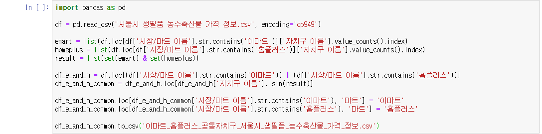 그 다음에 마트란 변수를 새로 만들어 이마트와 홈플러스 카테고리로 묶어주었습니다.