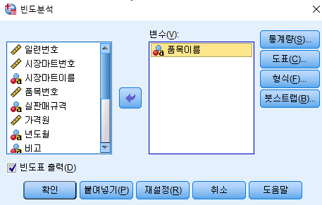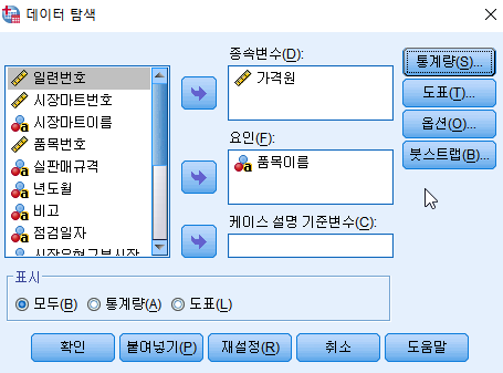 종속변수에 가격원을 요인에 품목이름을 넣어준 후 확인 버튼을 클릭합니다.