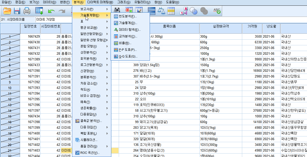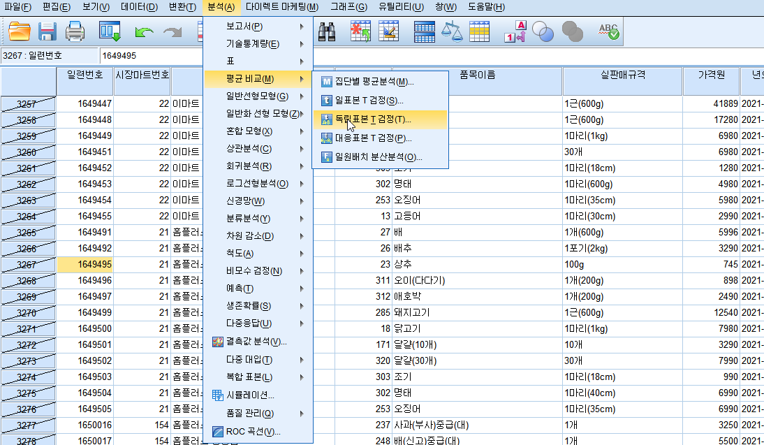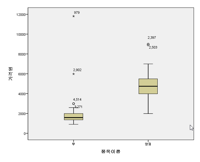 | [독립표본 T 검정] 서울시농수산식품공사 품목별등급별가격(도매시장) SPSS 분석 (0) | 2021.06.28 |
