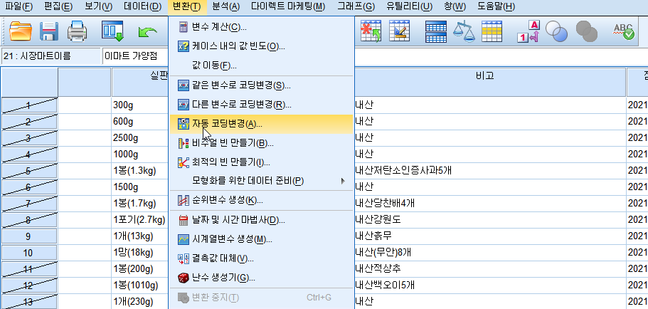 메뉴에서 변환 > 자동 코딩변경을 클릭합니다.