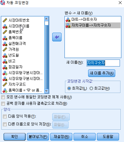 마트는 마트숫자로 자치구이름은 자치구숫자로 새 이름 추가를 해준 후 확인을 클릭합니다.