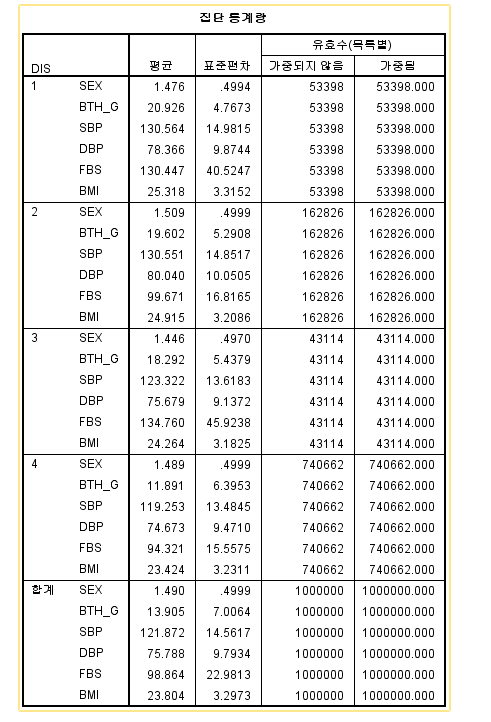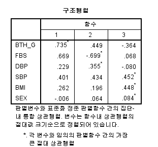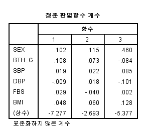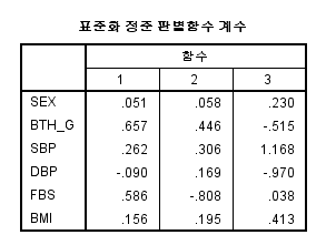 판별함수 Z1 = .102(SEX) + .108(BTH_G) + .019(SBP) - .009(DBP) + .029(FBS) + .048(BMI) -7.277입니다.