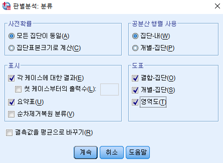 분류 옵션에서는 각 케이스에 대한 결과, 용약표, 결합-집단, 개별-집단, 영역도에 체크 표시합니다.