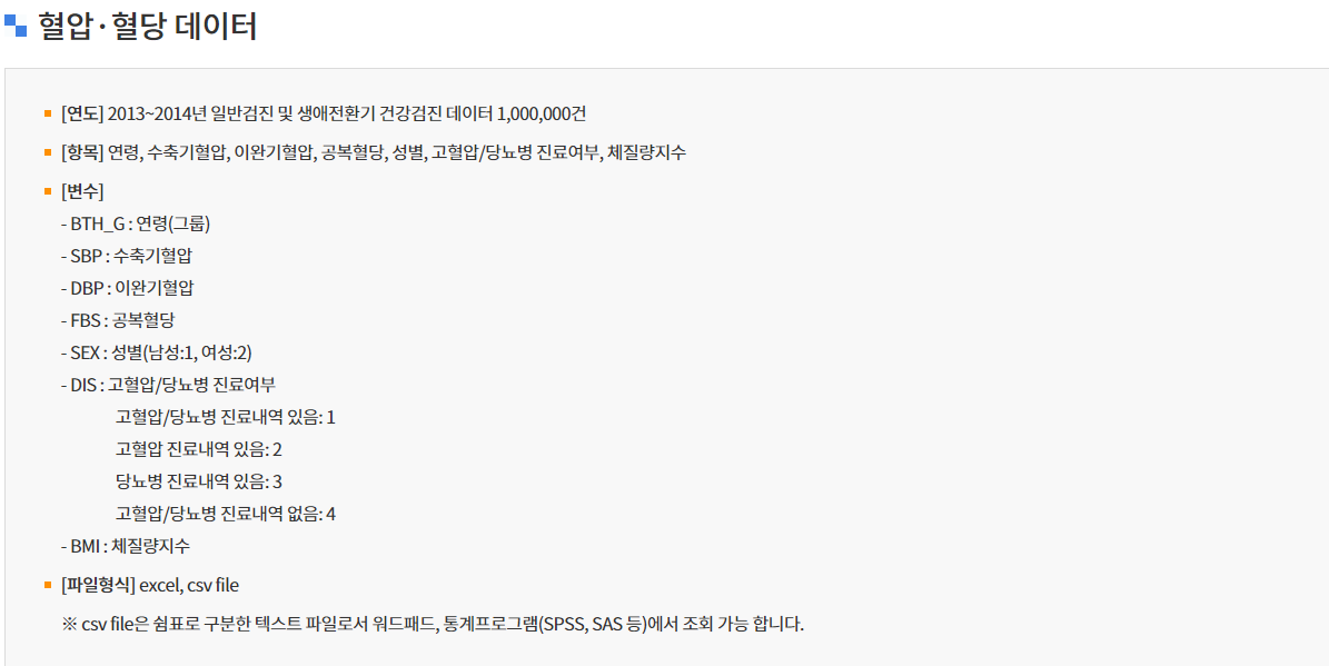 데이터는 국민건강보험에서 제공하는 혈압혈당데이터입니다.