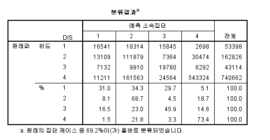 분류 정확도는 69.2%인데 4개 집단을 꽤 높은 수치로 정확하게 분류했다고 볼 수 있습니다.