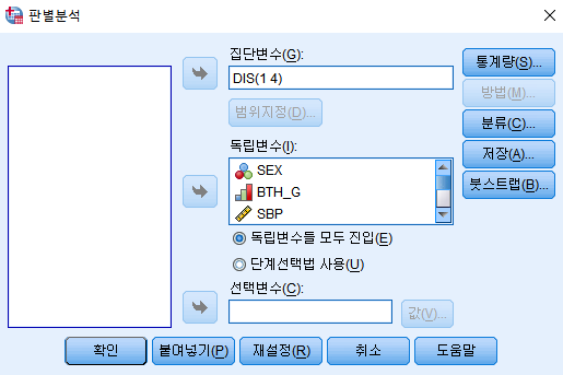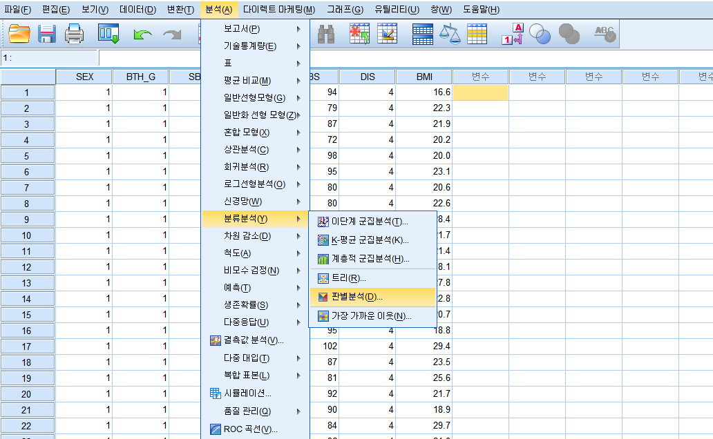 메뉴에서 분석 > 분류분석 > 판별분석을 클릭합니다.