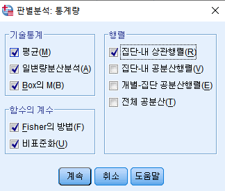 통계량을 클릭하고 평균, 일변량분산분석, Box의 M, Fisher의 방법, 비표준화, 집단-내 상관행렬에 체크 표시합니다.