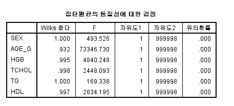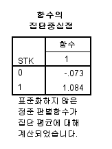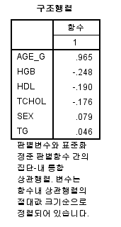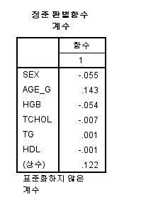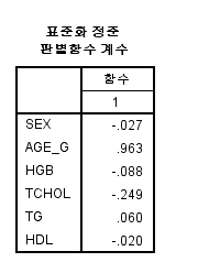 판별함수 Z1 = -0.055(SEX) + 0.143(AGE_G) - 0.054(HGB) - 0.007(TCHOL) + 0.001(TG) - 0.001(HDL) + 0.122입니다.