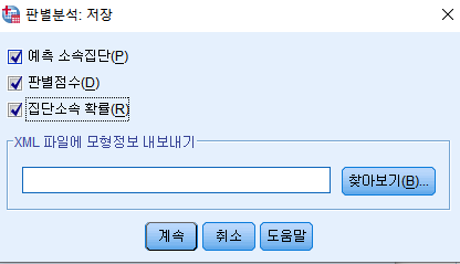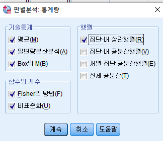 통계량을 클릭하고 평균, 일변량분산분석, Box의 M, Fisher의 방법, 비표준화, 집단-내 상관행렬에 체크 표시합니다.