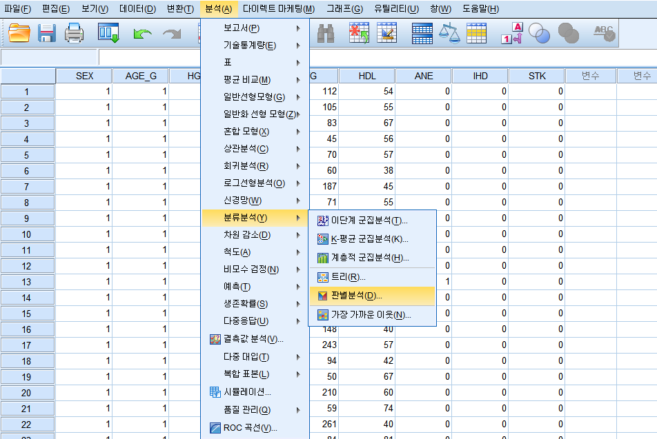 메뉴에서 분석 > 분류분석 > 판별분석을 클릭합니다.