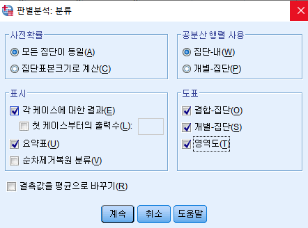 분류 옵션에서는 각 케이스에 대한 결과, 용약표, 결합-집단, 개별-집단, 영역도에 체크 표시합니다.