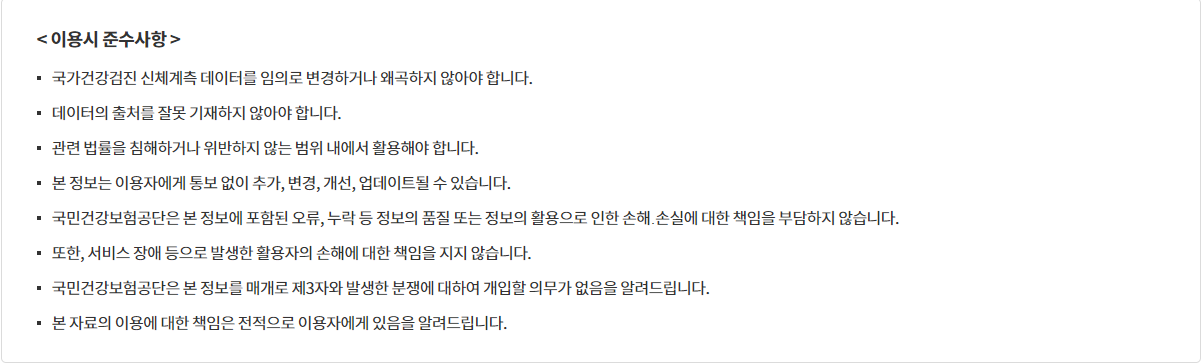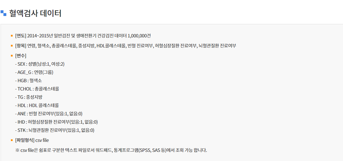 데이터는 국민건강보험에서 제공하는 혈액검사데이터입니다.