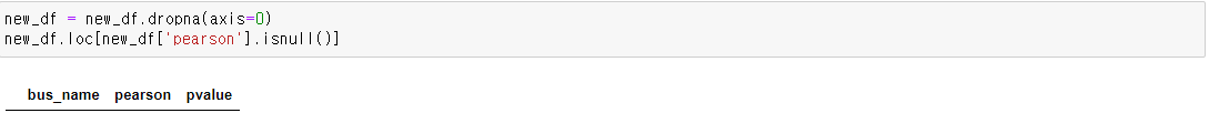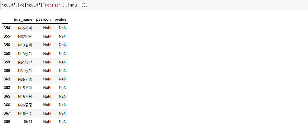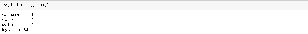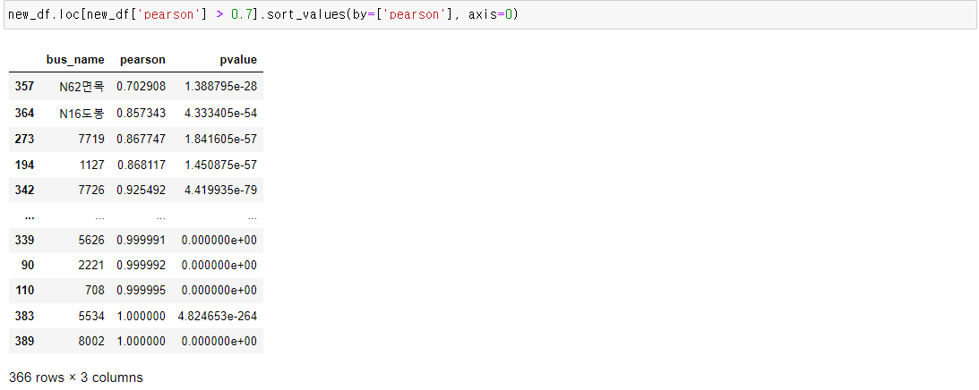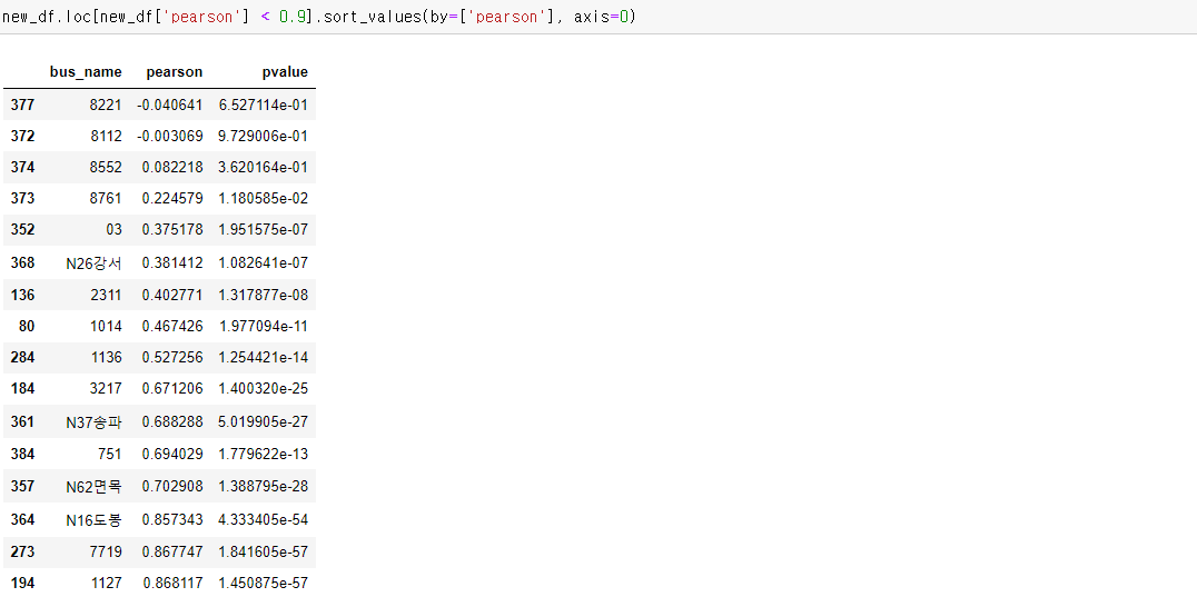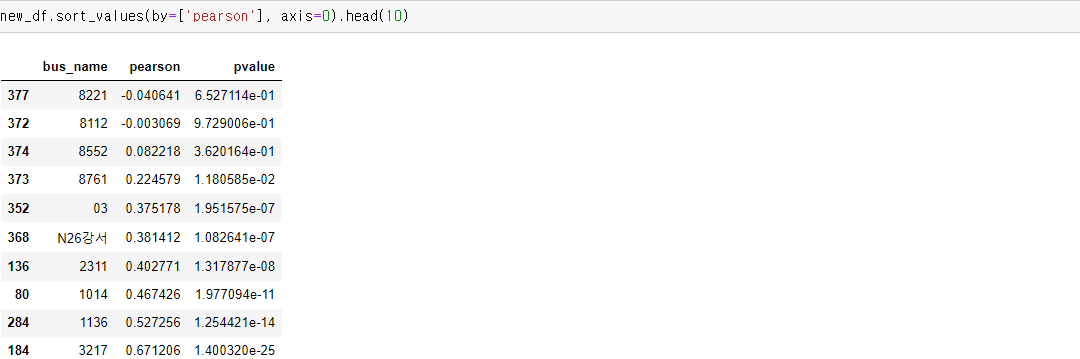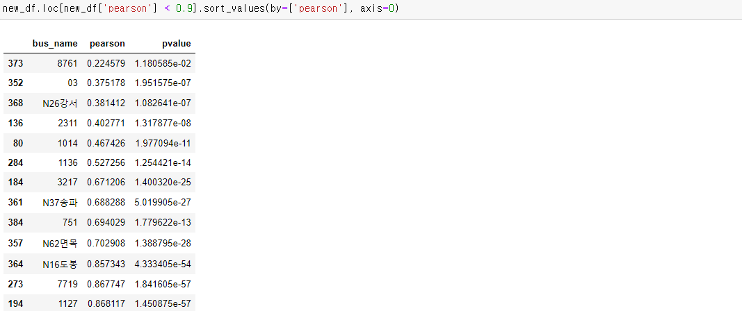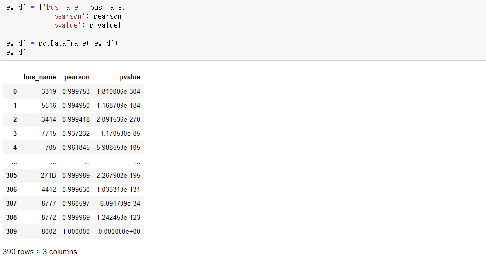 이제 노선명, 상관계수, p-value를 dataframe 형식으로 저장했습니다.