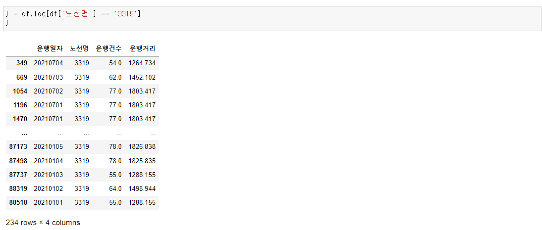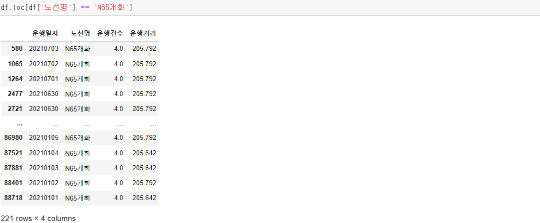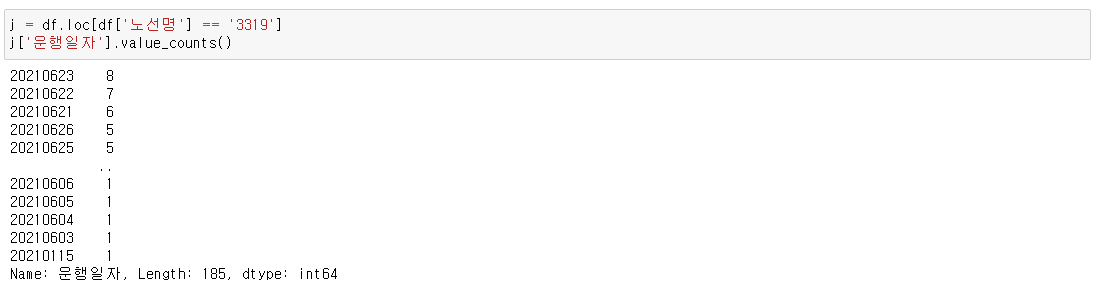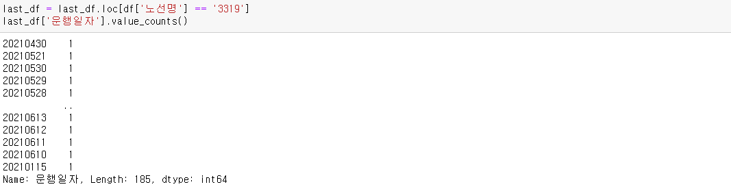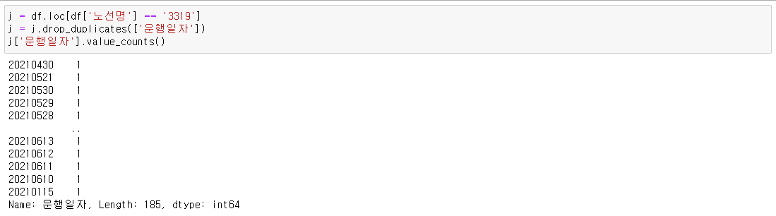 그랬더니 운행일자가 한 개가 아니라 여러 개로 중복된 값들이 보입니다.