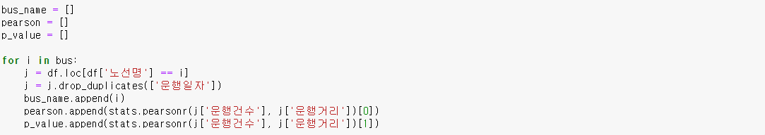 반복문을 써서 노선명마다 상관계수와 p-value 값을 추출하고 따로 리스트로 저장했습니다.