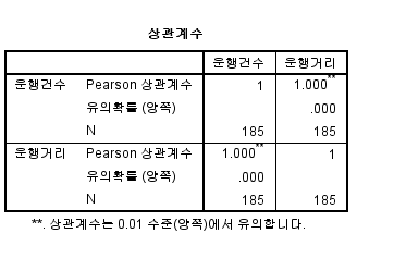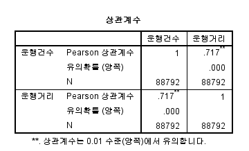운행건수과 운행거리의 상관계수는 0.717 유의확률(양쪽)은 0.000입니다.