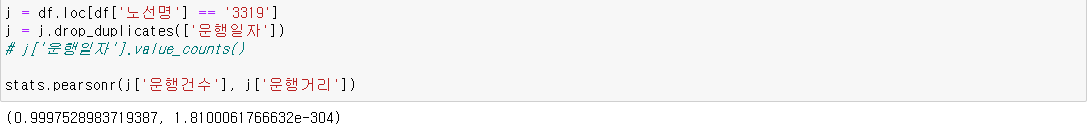 예상대로 운행건수는 같지만 운행거리가 조금씩 차이 나서 상관계수가 낮았습니다.