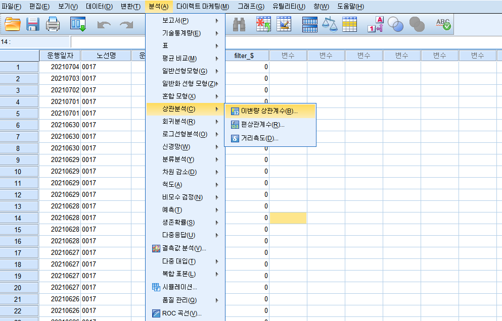 이 노선명만 이용해서 상관분석을 해보겠습니다.