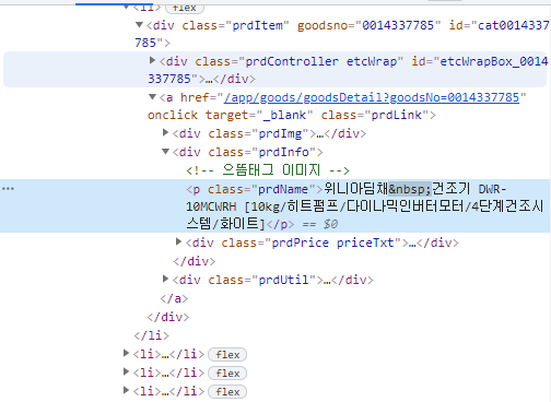 위의 사진에서 보면 <p class="prdName">에 제품명이 들어있습니다.
