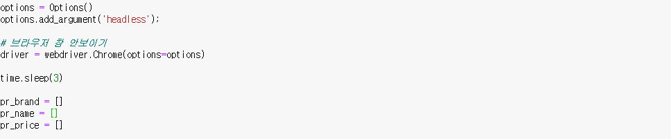 selenium으로 크롤링을 하면 크롬창이 뜨게 되는데 굳이 그럴 필요가 없으므로 뜨지 않게 설정했습니다.