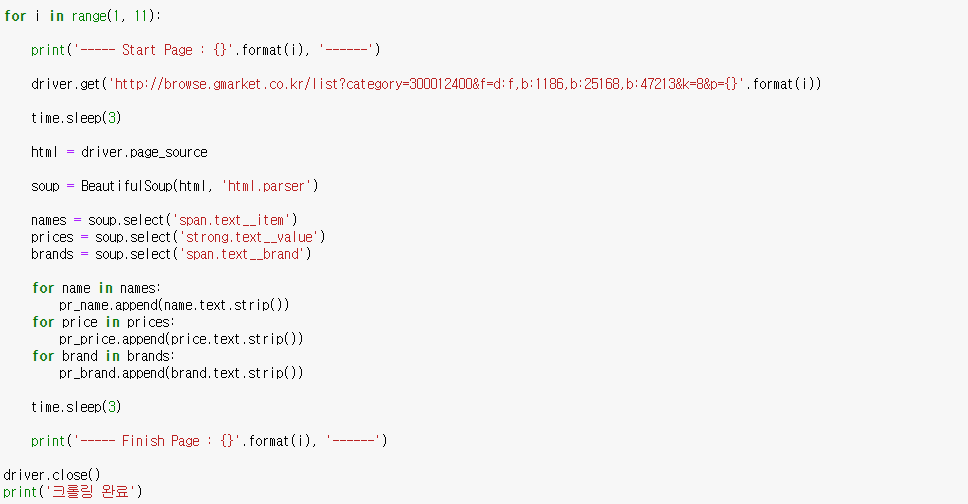 저는 10 페이지까지 크롤링 할 것이기 때문에 range를 1부터 11 (이래야 11은 제외)로 설정했습니다.
