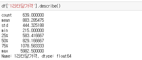 1리터당가격 변수의 기술통계량입니다.