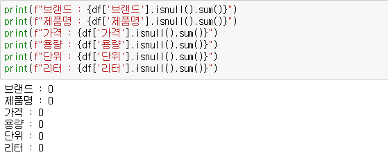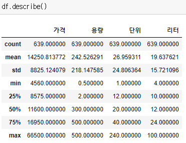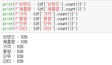가격, 용량, 단위, 리터 모두 count가 639이니 이 변수들은 결측치가 없습니다.