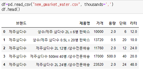 가격에 쉼표로 천 단위가 구별되어 있었기 때문에 thousands=',' 옵션을 미리 추가했습니다.