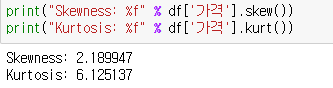 가격의 왜도와 첨도입니다.