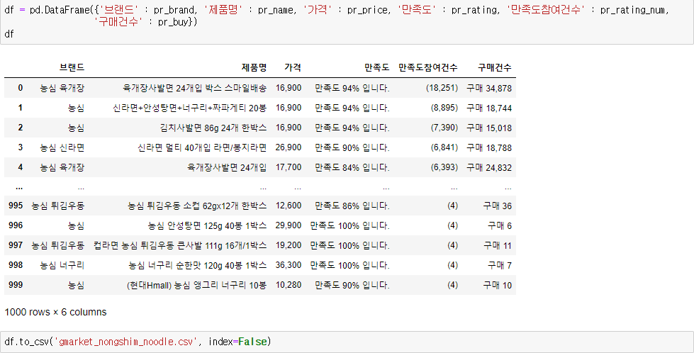 추출한 값들을 DataFrame 형식으로 만들어준 후 csv 파일로 저장했습니다.