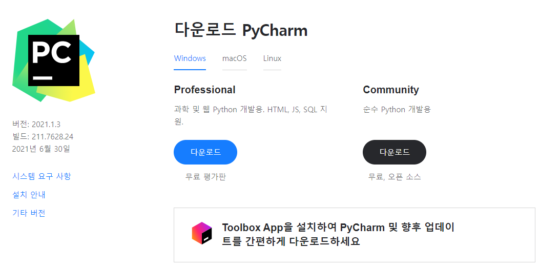 PyCharm이라는 개발 환경을 따로 다운 받아야 합니다.