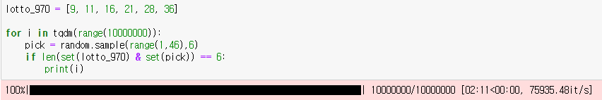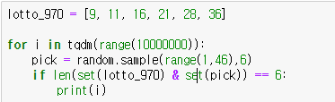 천 만번을 반복 하면서 자동 번호를 뽑을 것이고 이 번호 6개랑 970회 번호 6개랑 같으면