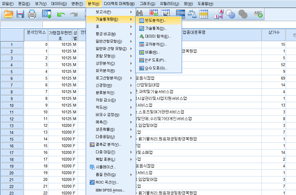 메뉴에서 분석 > 기술통계량 > 빈도분석을 클릭합니다.