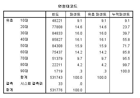 성별코드 결과표를 보면 전체 531,776 케이스 중 261,860 케이스가 여자, 269,916 케이스가 남자로 나타났습니다.