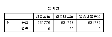성별코드와 업종대분류명은 유효한 케이스가 531776으로 결측 케이스가 없는데