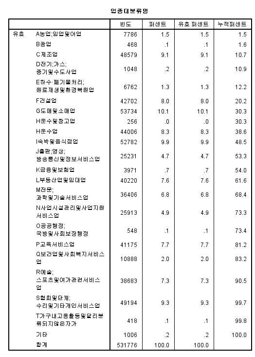 업종대분류명은 G도매및소매업이 53,734명(10.1%)로 가장 많았고, I숙박및음식점업 52,782명(9.9%), S협회및단체;수리및기타개인서비스업 49,194명(9.3%) 순으로 나타났습니다.