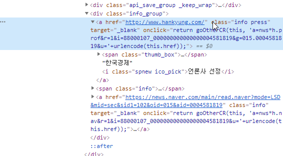 언론사 명은 위와 같이 태크 바깥의 text로 존재합니다.