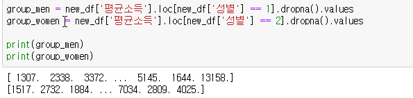 남성과 여성의 평균소득 값을 각각 group_men, group_women 변수에 할당했습니다.