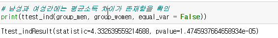 결과를 보면 t 값은 4.3326, 유의확률은 1.47e-0.5이므로 거의 0입니다.