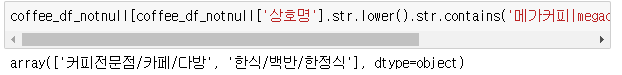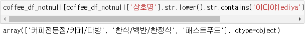 혹시나 일반인이 이디야가 포함되어 있는 상호를 쓸 수 있으므로 상권업종소분류명을 추가로 살펴봤습니다.