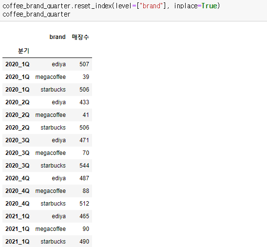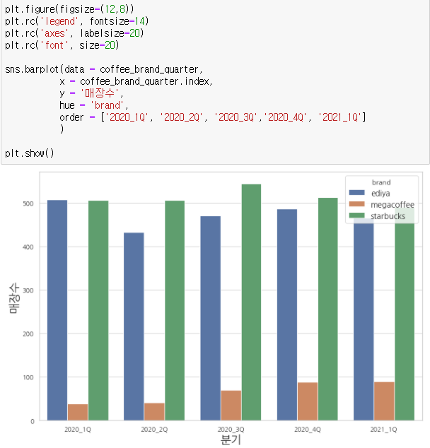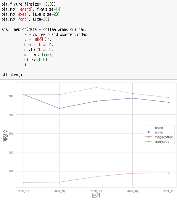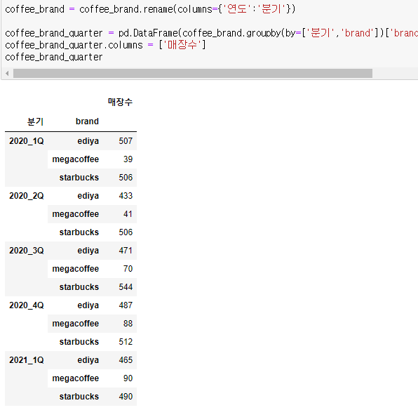 2020년 1분기부터 2021년 1분기까지의 커피 브랜드 매장 수가 어떻게 변했는지 알아보겠습니다.