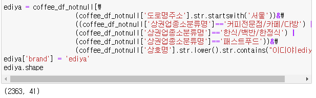 상호명 이디야가 Ediya처럼 영어로 되어있을 수도 있으므로 조건에 이디야|ediya 합집합 형태로 넣었습니다.