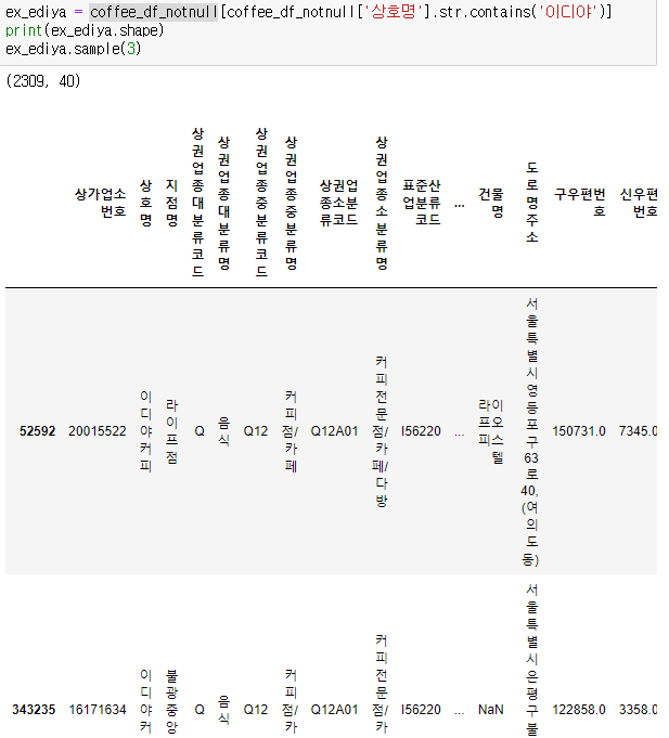 상호명에 이디야가 포함되어 있는 데이터셋만 출력해보았습니다.