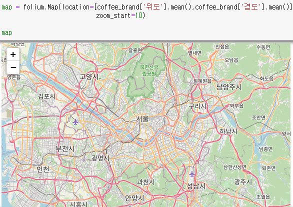 zoom_start를 10 정도로 설정해 서울을 보이게 했습니다.