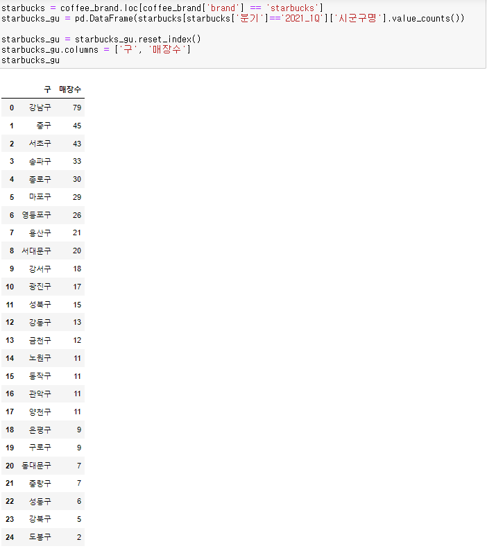 실제로 스타벅스의 2021년 1분기의 구별 매장 수를 보면 강남구, 중구, 서초구 순으로 많습니다.