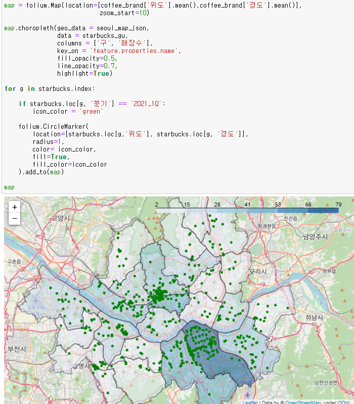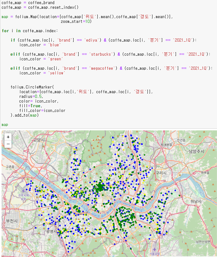 이번에는 2021년 1분기 스타벅스만 지도로 시각화를 해봤습니다만