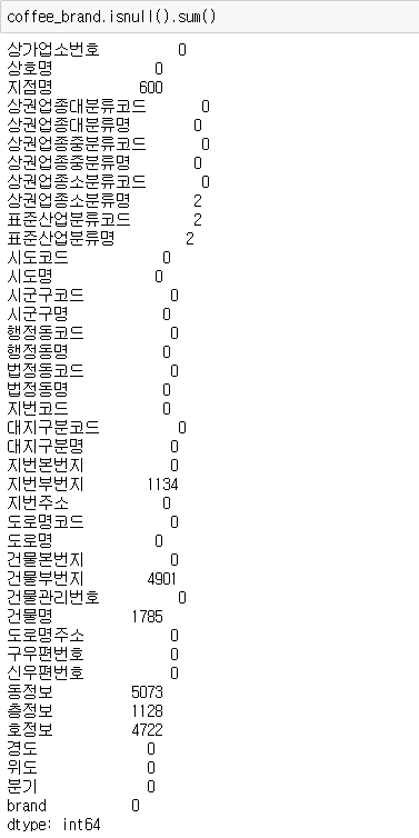 결측치 수를 확인한 결과 상호명과 경도, 위도에서 보이지 않으니 그대로 사용하겠습니다.