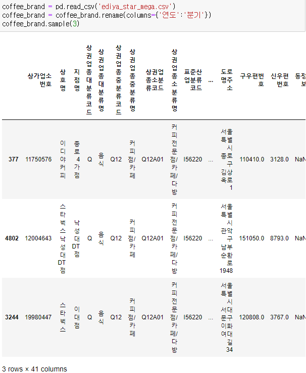 오늘은 소상공인시장진흥공단 상가(상권)정보 데이터를 가지고 커피 브랜드 몇 곳을 시각화해보겠습니다.